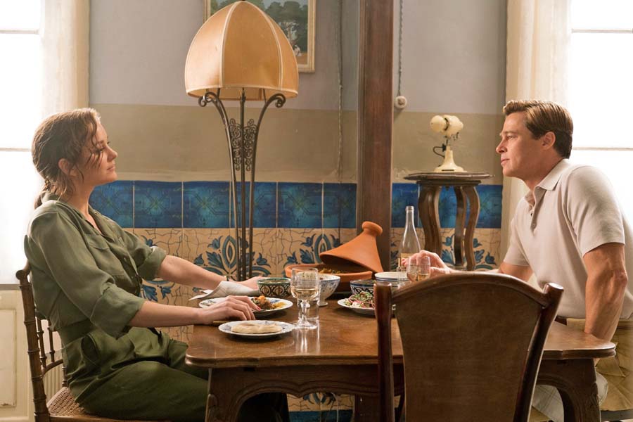 Marion Cotillard plays Marianne Beausejour and Brad Pitt plays Max Vatan in Allied from Paramount Pictures.