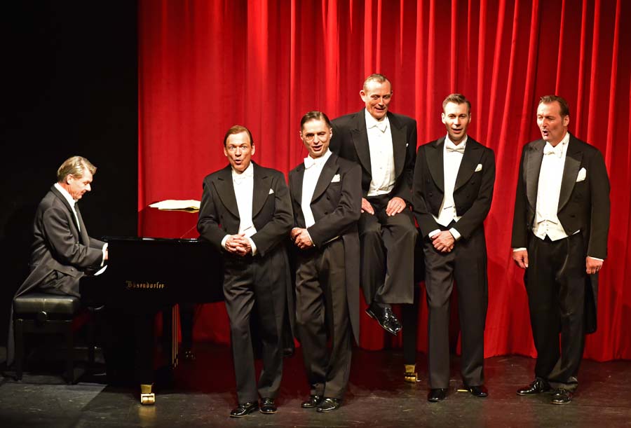 Die Comedian Harmonists, v.l.n.r. Horst Maria Merz (Erwin), Holger Off (Ari), Olaf Drauschke (Erich), Ralf Steinhagen (Roman), Ulrich Bildstein (Harry), Rolf Steinhagen (Robert), Komödie am Kurfürstendamm, © Holger Jacobs