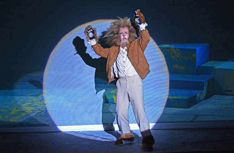 Der ängstliche Löwe (Carsten Sabrowski), Dorothy (Alma Sade) trifft auf dem Weg zum Zauberer von Oz die Vogelscheuche (Christoph Späth), “Der Zauberer von Oz” © Holger Jacobs| Kultur24.berlin