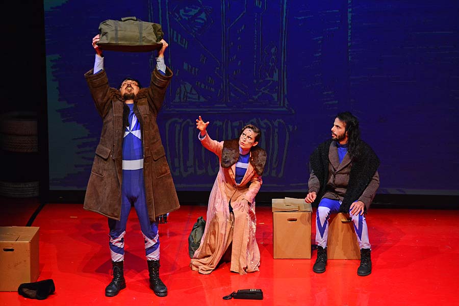 Stepan (Till Wonka) hebt die Bombe, „Die Gerechten“, Albert Camus, Maxim Gorki Theater © Holger Jacobs