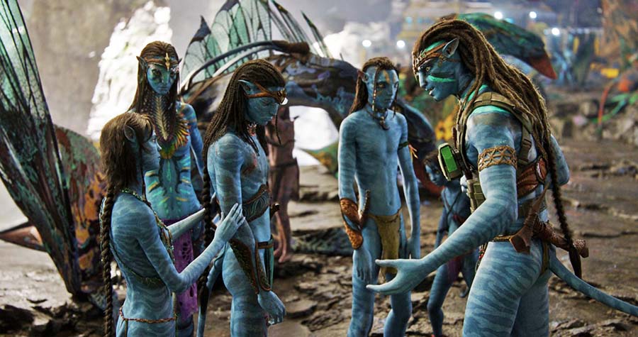 (L-R): Kiri, Neytiri, Neteyam, Lo’ak, Tuk, and Jake Sully in 20th Century Studios‘ AVATAR: THE WAY OF WATER. Photo courtesy of 20th Century Studios. © 2022 20th Century Studios. All Rights Reserved.
