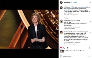 Zu erwähnen wäre noch die Laudatio von MICK JAGGER für den Besten Filmsong („El Mal“ in „Emilia Perez“), der mit 81 Jahren noch fit wie ein Turnschuh ist.