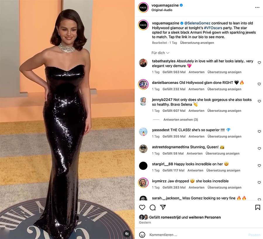 SELENA GOMEZ in Armani, Vanity Fair Party © Instagram/ Vogue