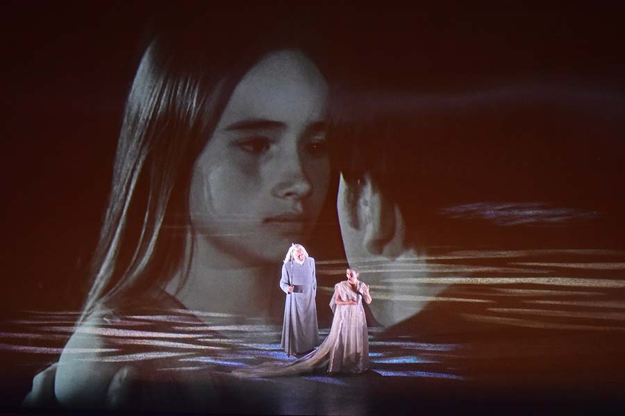 Leila erinnert sich an ein Erlebnis in ihrer Kindheit (Charlotte Knubel), als sie einem Mann das Leben rettete, „Die Perlenfischer“, Staatsoper Berlin © Holger Jacobs
