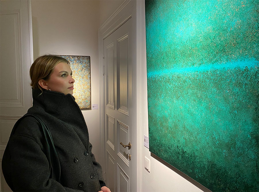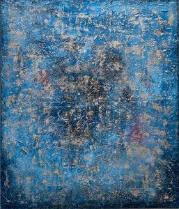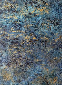 Sieht man näher hin, erkennt der Betrachter eine unruhige Struktur, hervorgebracht durch dick aufgetragenen Acryl auf Leinwand, vermischt mit Edelmetallen. Gold und Silber blitzen hervor und geben den Bildern etwas Strahlendes.