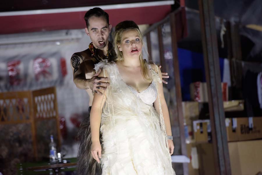 Faust von Charles Gounodin französischer Sprache mit deutschen Übertiteln30. Oktober 2016Musikalische Leitung: Marc SoustrotRegie: Frank CastorfBühne: Aleksandar DenićKostüme: Adriana Braga PeretzkiLicht: Lothar BaumgarteVideoregie: Martin AnderssonChor: Johannes KnechtDramaturgie: Ann-Christine MeckeAuf dem Bild: Adam Palka (Mephistopheles), Mandy Fredrich (Margarethe)Foto: Thomas Aurin