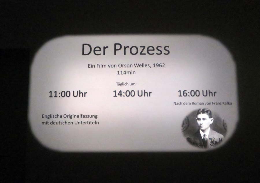 Der Film von Orson Wells nach dem gleichnamigen Roman von Franz Kafka wird in der Ausstellung 3 x täglich gezeigt, Ausstellung “Franz Kafka. Der ganze Prozess”, Foto: Holger Jacobs