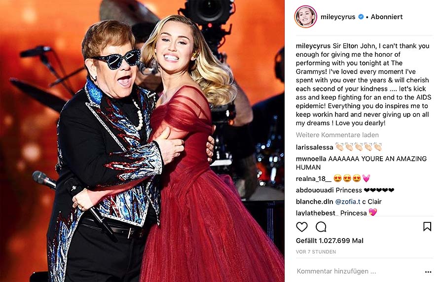 Elton John und Miley Cyrus, The Grammy Award 2018 © Instagram
