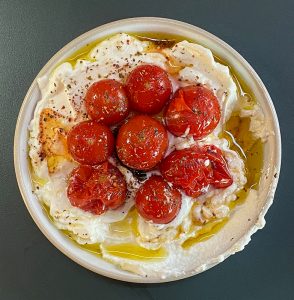 „Tomato & Olive Tart“ with cooked, small tomatoes in a kind of feta cream and topped with olive oil.