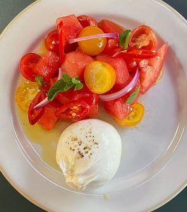 „Beautiful Burrata“ with mozzarella cheese, watermelon, and chili