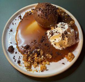 For dessert, we chose a classic chocolate mousse, called „Ultimate Chocolate Mousse,“ with the aforementioned chocolate mousse, cream, and hazelnut pralines, immersed in a caramel sauce.