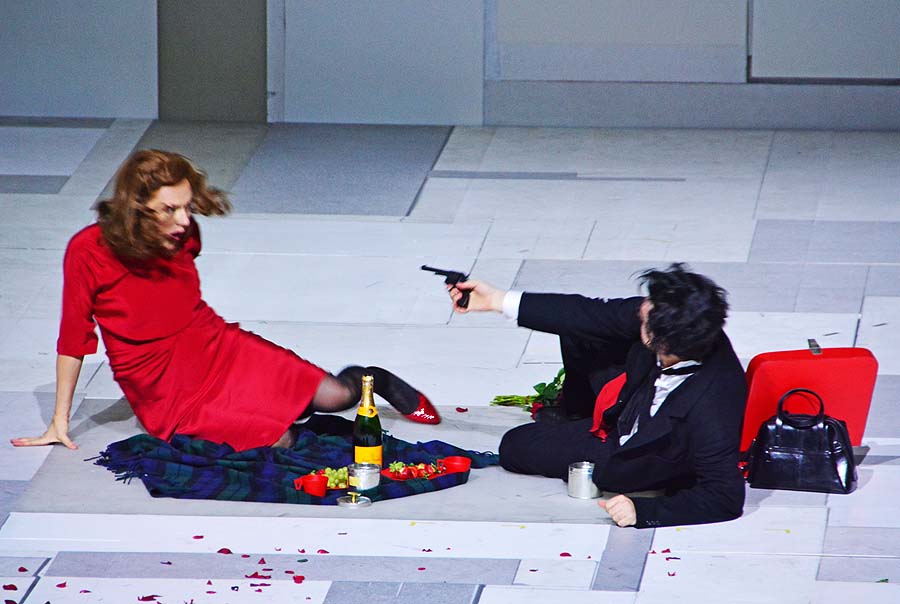 2. Akt “Juliette”, Staatsoper Berlin, Juliette (Magdalena Kozena) verspottet Michel (Rolando Villazon), woraufhin er sie erschießt © Holger Jacobs