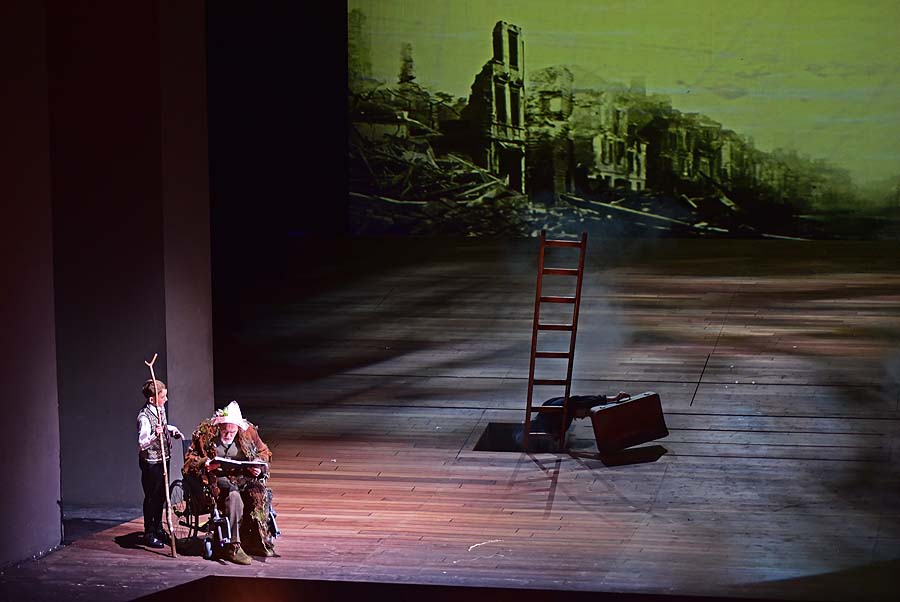 Merlin (Hans-Michael Rehberg) und der kleine Junge, „King Arthur“, Staatsoper Berlin, Foto: Holger Jacobs