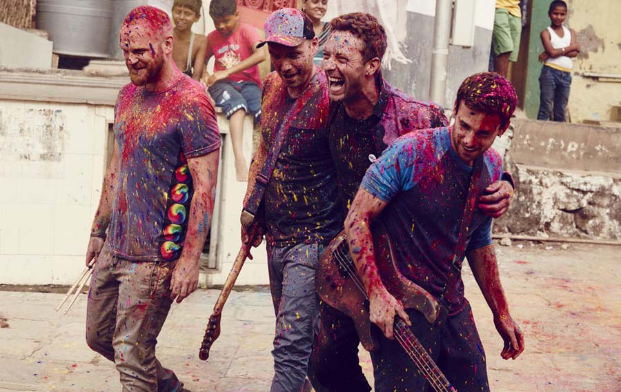 Die Rock-Gruppe Cold Play bei einem „Color Fest“ in Indien, bei dem sich die Menschen mit farbigem Pulver bewerfen