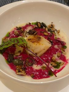 As an intermediate course, we were served a small risotto with lobster in a fruity berry sauce. Delicious!