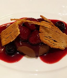 A dark chocolate cream shaped like a wafer with raspberries and blueberries in a raspberry sauce.