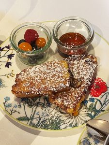I got myself some croissants and jam and ordered scrambled eggs and French toast (in German, „Armer Ritter,“ toast dipped in egg white, then briefly fried, sprinkled with powdered sugar, and dipped in maple syrup).