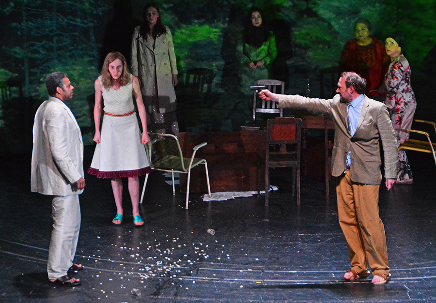 Mehrmals schiesst Onkel Wanja (Tim Porath) auf den Prof. (Falilou Deck), “Onkel Wanja”, Foto Holger Jacobs