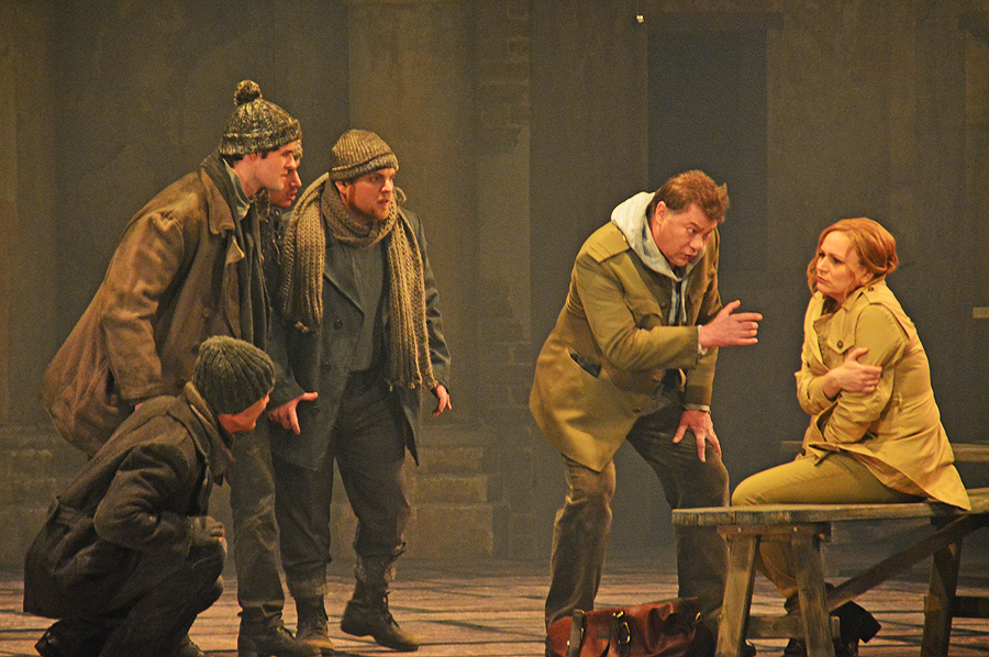Gurnemanz (René Pape) versucht sie in Schutz zu nehmen – Parsifal – Foto: Holger Jacobs