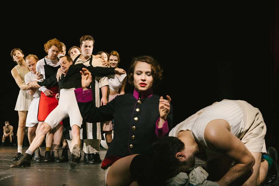 Marius Michael Huth, Ferdinand Nowitzky, Peter Rahmani, Maximilian Herzogenrath, Merlin Sandmeyer, Nick Alexander Pasveer, Yannick Schöbi, Sofia Falzberger, Lorena Emmi Mayer, Andrea Wenzel, Philipp Hauß, „Redatzkymarsch“, Wiener Burgtheater © Marcella Cruz/ Burgtheater
