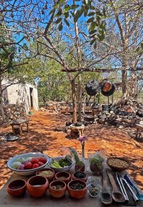 A somewhat rustic but lovingly prepared cooking landscape, accompanied by cackling chickens, with different stations: washing, cutting, cooking, grilling and the earth oven for stewing.