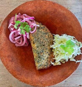 Die Variation von Tostones, ein “Taco” aus frittierter Kochbanane, – dieser mit knusprig saftigem Schweinebauch und mojo cubano, einer kubanischen Marinade aus Knoblauch, Bitterorange, Zwiebel und frischen Kräutern – und den Tacos – mit einem Salat aus Chaya (Baumspinat), dessen Blätter in der yucatekischen Küche vielfältig Verwendung finden, mit geriebenem, gealtertem Käse – sind spannend und eine erfreuliche Abwechslung zu den doch sehr ähnlich schmeckenden Tacos auf der Straße.