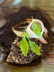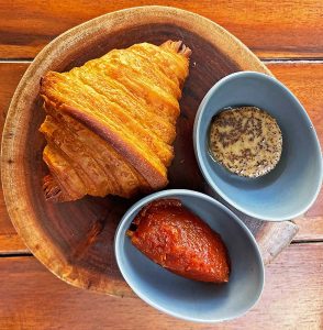 Hier wird spürbar keine Mühe gescheut. Zum selbstgebackenen Sauerteigbrot wird eine mit Kaffee versetzte Butter gereicht, welche noch vor dem Gast mit einem Bunsenbrenner karamellisiert wird, dazu gibt es hausgemachte Papaya-Marmelade.
