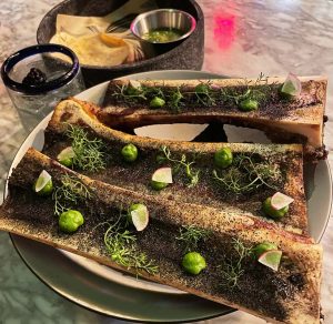 The tuetanos al carbon – marrow bones from the fire, sprinkled with onion ash and dabbed with a green chili emulsion, served with tortillas, what else. Increíble, if you like it. Furthermore, we also order the pastel de choclo, a traditional corn casserole, here prepared as a gratin with brie and rosemary and flambéed with mezcal at the table.