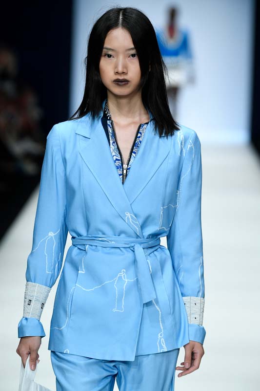 Neonyt Fashion Show, Designer Rhumbaa, BERLIN, GERMANY – JULY 02: A model wearing a suit by Rhumaa, jacket by Besonnen, earrings by Nouare Jewelry, bracelets by Alama and shoes by Trippen walks the runway at the NEONYT show during the Berlin Fashion Week Spring/Summer 2020 at ewerk on July 02, 2019 in Berlin, Germany. (Photo by Stefan Knauer/Getty Images for NEONYT)