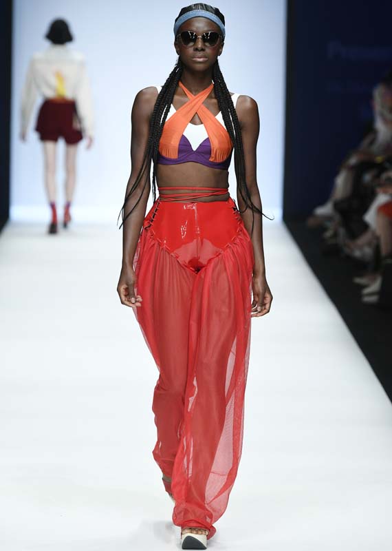 Neonyt Fashion Show, BERLIN, GERMANY – JULY 02: A model wearing trousers by Victoria Eviston-Putsch, bra by Calida, bikini Top by Phylyda, glasses by Neubau, hat by Fade Out Label, earring by The Boyscouts and shoes by Trippen walks the runway at the NEONYT show during the Berlin Fashion Week Spring/Summer 2020 at ewerk on July 02, 2019 in Berlin, Germany. (Photo by Stefan Knauer/Getty Images for NEONYT)