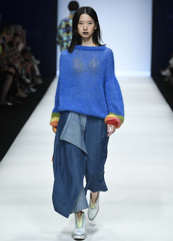 Neonyt Fashion Show, BERLIN, GERMANY – JULY 02: A model wearing a jumper by Faible & Failure, trousers by Sepideh Ahadi, bikini top by Anek, bag by Alexandra Svendsen and shoes by Marita Moreno walks the runway at the NEONYT show during the Berlin Fashion Week Spring/Summer 2020 at ewerk on July 02, 2019 in Berlin, Germany. (Photo by Stefan Knauer/Getty Images for NEONYT)