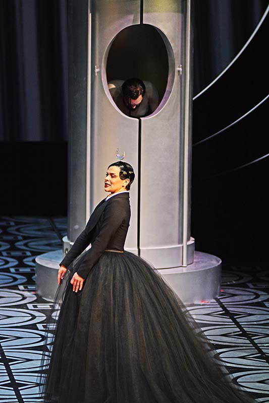 That in today’s time a veil dance no longer seems quite opportune, is obvious. The sexism debate of the last few months hardly allow the portrayal of women as a pure sexual object. For example, with director Hans Neuenfels, this Salome (convincing: Ausrine Stundyte) is not a delicate creature with flowers in her hair and transparent veil dresses, but a harsh business woman in a black tuxedo with short, curled hair. Even such a phenomenon can of course be sexy. This fits a Herodes with a somewhat submissive kind (great voice by Gerhard Siegel) certainly to a whip-swinging domina. In contrast, the mother of Salome, Herodias (excellently voice by Marina Prudenskaya), still quite the classic type of woman: bland blond, tight-fitting glittering dress, eyelash limbs. I particularly liked the depiction of Jochanaan: a black, floor-length dress reveals a broad, white-colored breast. This long, black hair and a black beard. It shows greatness and grandeur. Even singer Thomas J. Mayer in this role as Jochanaan, who is above the earthly desires, is impressive.