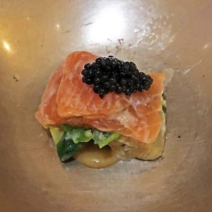 Als Erstes gab es ein luftig gequirltes Ei, eine japanische Variante des Eierstichs, mit einem kühlen Gelee aus Dashi, welches dezent nach Algen schmeckte, weicher und doch texturstarker Krabbe, geschmacksintensivem Seeigel und knackiger Okraschote. Dashi ist ein japanischer Fischsud, welcher aus Flocken des Bonito, einer Thunfischart, und braunem Seetang gewonnen wird. Darauf folgte ein fabelhaftes Trio aus Aubergine, Jakobsmuschel und in Reis mariniertem, butterweichen Lachs, dazu eine Sauce aus Miso und würzig scharfem, japanischem Senf, zusammen mit Frühlingszwiebel und Kaviar.