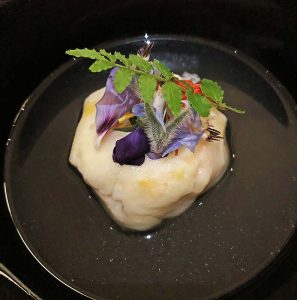 I also liked course number 6 very much. He offered something for the eye, with the combination of white Onsen-egg, the pickled red tomato, covered with delicate purple chive flowers, and also for the palate. A cold, tender pink roasted beef steak with a sauce based on soy sauce, mirin (a sweet rice wine mainly used for cooking), sake and broth and a taste-binding Onsen-egg were simply umami in combination – tasty, savoury. An Onsen-egg is cooked according to the Japanese cooking method at 68°C for at least one hour, giving the egg white and yolk the identical creamy, smooth and even structure.