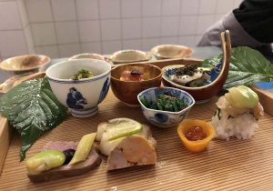 Ein weiteres besonderes Geschmackserlebnis erfuhr ich, als ein Tablettchen mit „Verschiedenen Kleinigkeiten“, im Japanischen Hassun genannt, aus Produkten der Region serviert wurde. Neben einer leicht süßlichen Kreation aus Birne und Feige in einer cremigen Tofu-Sesamsoße mit erdigem Rote-Beete Chip, Oktopusscheiben mit grünem Spargel verquirlt mit Eigelb und säuerlicher Brombeere, oder einem mit Lachskaviar gefülltem Kumquat (Zwergorangen)-Biskuit, stach für mich insbesondere die Kombination aus gegrillte Rotbarsch mit Limette und Seeteufeleber hervor.