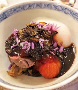 Gang 6 gefiel mir außerdem sehr gut. Er bot was fürs Auge, mit der Kombination aus weißem Onsen-Ei, der eingelegten roten Tomate, übersäht von zart-lilafarbenen Schnittlauchblümchen, und auch für den Gaumen. Ein kaltes, zart rosa gebratenes Rindersteak mit einer Sauce aus basierend auf Soja Soße, Mirin (ein hauptsächlich zum Kochen verwendeter süßlicher Reiswein), Sake und Brühe und dazu ein geschmacksbindendes Onsen-Ei waren in der Kombination schlichtweg umami – schmackhaft, würzig. ­Ein Onsen-Ei wird nach japanischer Garmethode bei 68 Grad für mindestens eine Stunde lang gekocht, wodurch Eiweiß und Eigelb eine ganz eigene, cremig geschmeidige und gleichmäßige Struktur bekommen.