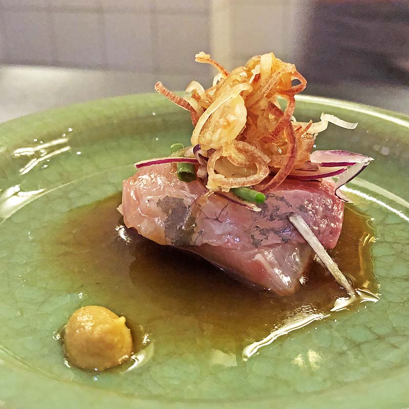 Gelbschwanzmakrele in Ponzu-Sauce aus Soya, Yuzu und Dashi ©JK