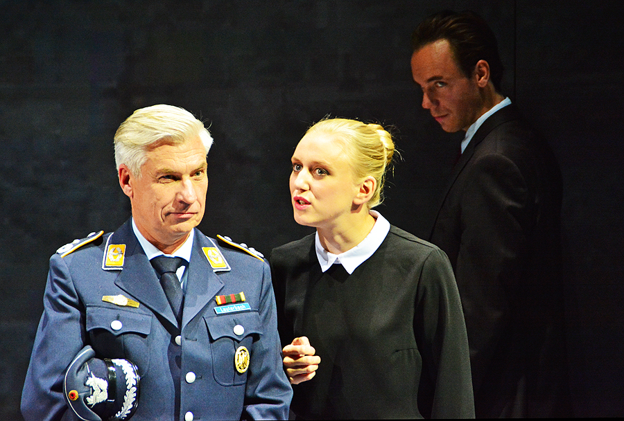 General Lauterbach (Helmut Mooshammer), Staatsanwältin Nelson (Franziska Machens) und Angeklagter Lars Koch (Timo Weisschnur), „Terror“, © Holger Jacobs