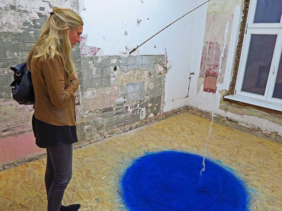 Besucherin Lala Minou Moebius und der blaue Salzkristall von Künstlerin Mariana Hahn, THE VACANCY, © Holger Jacobs